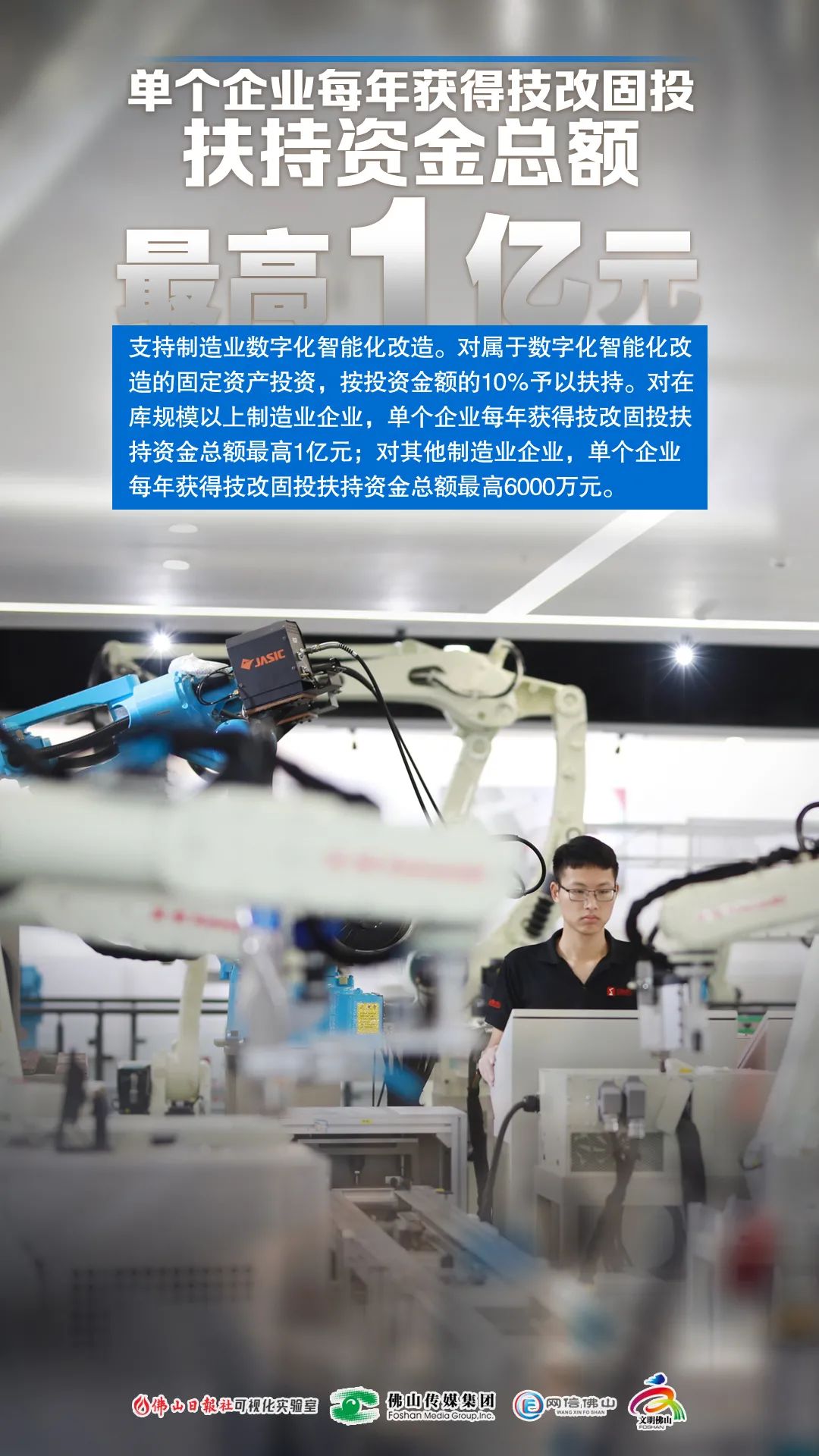 继续实施佛山市工业企业技术改造固定资产投资扶持政策,对属于数字化设备及其配套装置、数字化系统、工控软件等数字化智能化改造的固定资产投资,按投资金额的10%予以扶持,其他技术改造固定资产投资按原比例扶持。对在库规模以上制造业企业,单个企业每年获得技改固投扶持资金总额最高1亿元;对其他制造业企业,单个企业每年获得技改固投扶持资金总额最高6000万元。