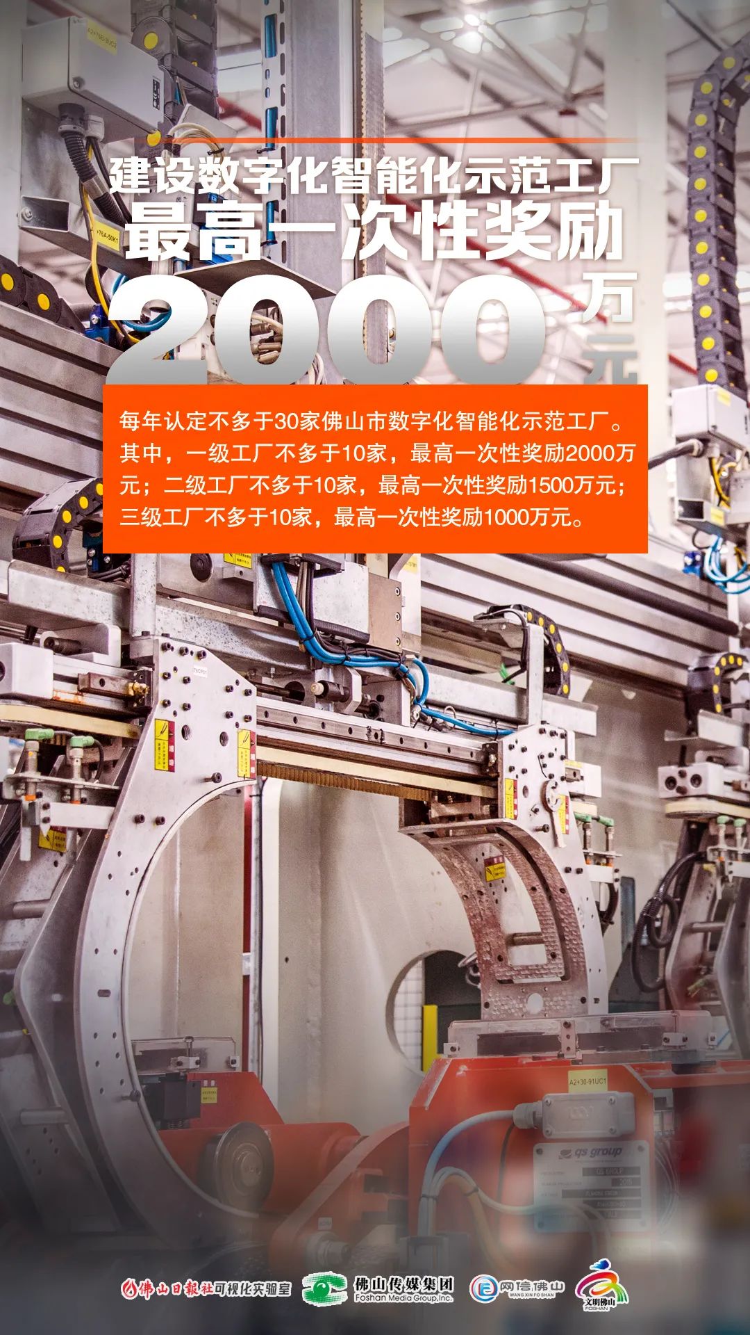 《若干措施》提出,佛山将每年认定不多于30家佛山市数字化智能化示范工厂、不多于100个佛山市数字化智能化示范车间,每年评选不多于30个佛山市工业互联网标杆示范项目、不多于30个以机器人应用为代表的佛山市数字化智能化改造标杆示范项目。其中,一级数字化智能化示范工厂不多于10家,最高一次性奖励2000万元;二级数字化智能化示范工厂不多于10家,最高一次性奖励1500万元;三级数字化智能化示范工厂不多于10家,最高一次性奖励1000万元。